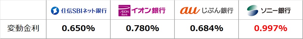 先月の日銀による政策金利は据え置きとなり、変動金利は軒並み横ばいで推移しています。唯一、ソニー銀行のみ+0.1%上昇しています。