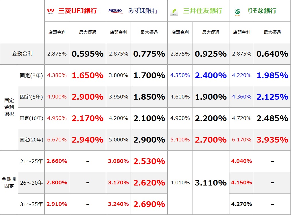 ※文字の色について、赤い金利=先月よりも上昇、黒い金利=先月と同じ、青い金利=先月より下降
