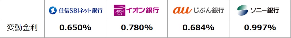 変動金利は横ばいが続いていますが、三菱UFJ銀行のみ金利優遇幅の縮小により適用金利が上昇となりました。