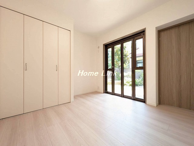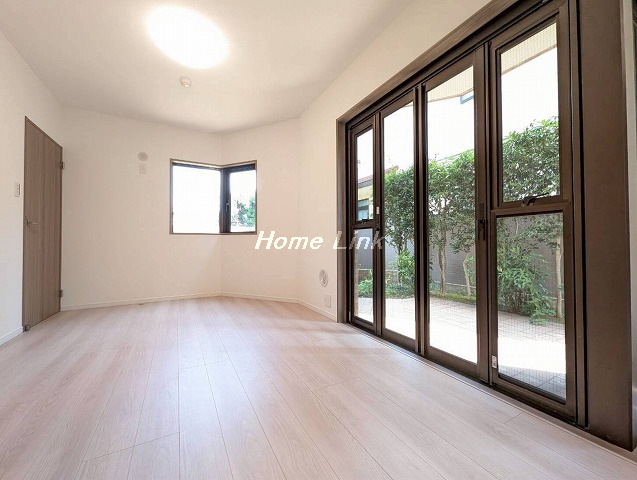 室内はリフォームを実施してのお引渡しです。1階住戸で、リビング先の屋外はタイル張りのテラス、その先に約50平米の専用庭があります。角部屋で玄関や浴室、トイレにも窓があるのが嬉しいポイントです。